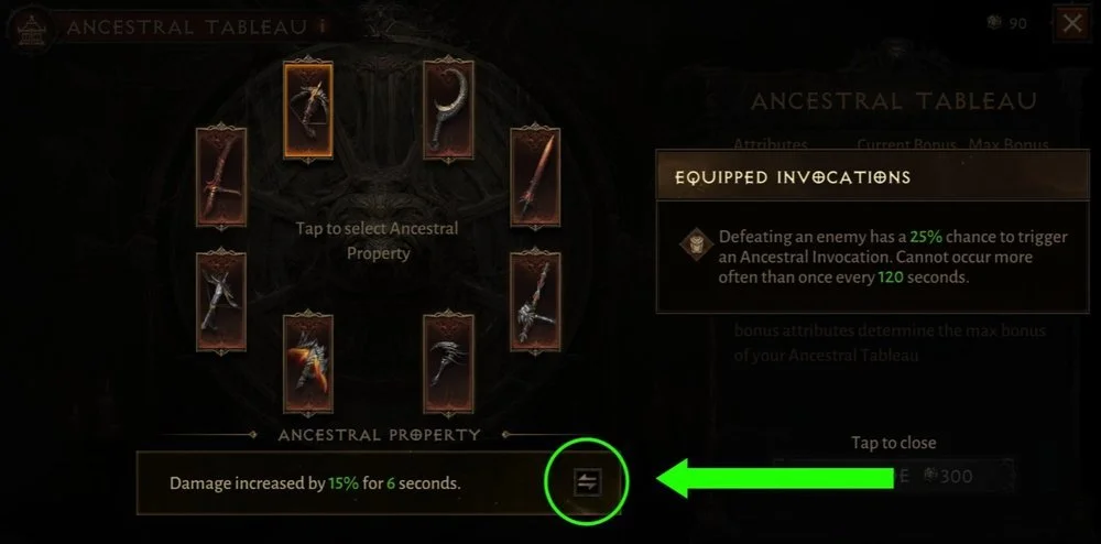 To change your Ancestral Property all you have to do is click the small symbol next to your buff and then click another weapon in the Tableau.
