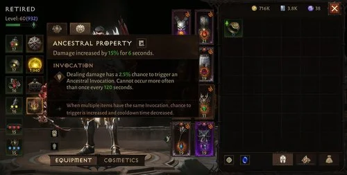 Your equipped Invocation will determine the method and how often you will be able to proc your Ancestral Property. When multiple items have the same Invocation, chance to trigger is increased and cooldown time is decreased.