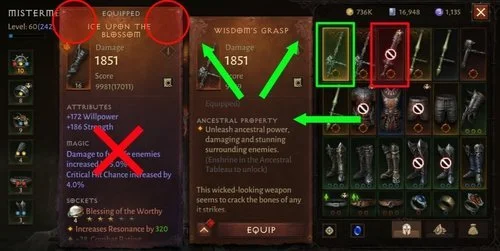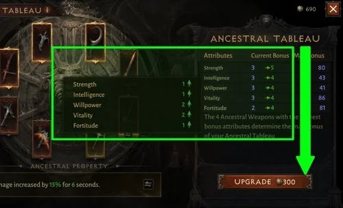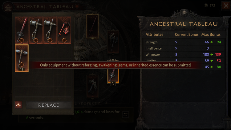 You need to equip an Ancestral Weapon in the Ancestral Tableau to activate its Ancestral Property. The 4 Ancestral Weapons with the highest bonus attributes determine the Max Bonus of your Ancestral Tableau. *You cannot Enshrine equipment that has been Reforged, Awakened or Inherited with essence.
