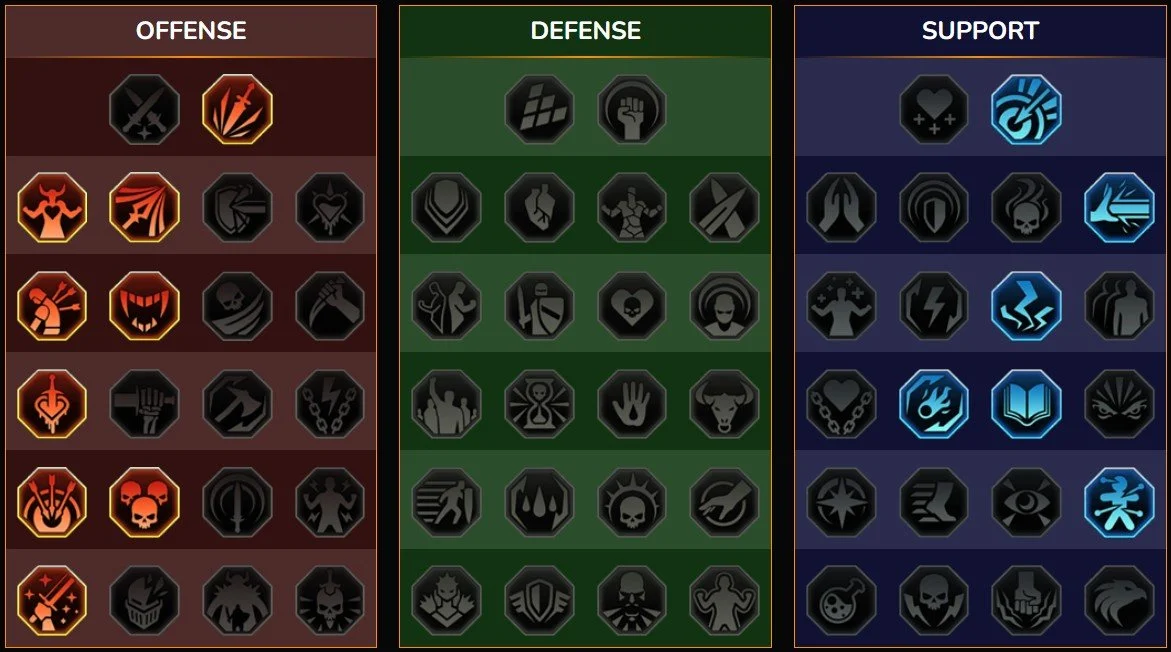 Offense — Deadly Precision, Keen Strike, Heart of Glory, Single Out, Life Drinker, Bring it Down, Methodical, Kill Streak, Warmaster.