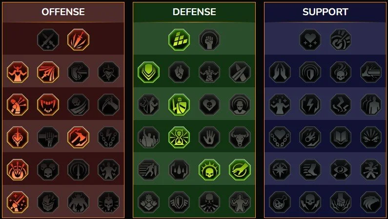 Offense — Deadly Precision, Keen Strike, Heart of Glory, Single Out, Life Drinker, Bring it Down, Cycle of Violence, Methodical, Warmaster.